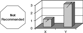 One form of clutter is adding a pseudo third dimension to bars, pies, lines, or other graphical elements. The unnecessary dimension often distorts the data. It always adds clutter. If bars are drawn with depth, the reader does not know how to read the bar. Is the value read from the front where the arrow on the X bar points or from the back where the arrow on the Y bar points? It turns out that the way to read these bars depends on the software that was used to create them, but the reader rarely knows what software was used. Two-dimensional bar charts are unambiguous. If the designer chooses to use a bar chart and knows the categories and values of the data, then a two-dimensional bar chart should always be the choice.