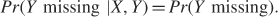 Many missing data methods are valid only if the data are missing completely at random. Suppose that only one variable Y has missing data and that there are other variables (represented by the vector X) that are always observed. We say that data on Y are missing completely at random if the probability of missing data on Y is completely unrelated either to X or to Y itself. Symbolically, this is expressed as