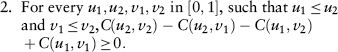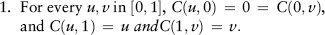 - For every u, v in [0, 1], C(u, 0) = 0 = C(0, v), and C(u, 1) = u and C(1, v) = v.
