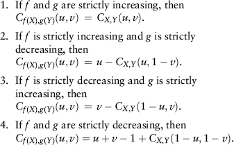 Much of the usefulness of copulas in nonparametric statistics is due to the fact that for strictly monotone transformations of the random variables under interest, copulas are either invariant or change in predictable ways. Specifically, let X and Y be continuous random variables with copula CX,Y, and let f and g be strictly monotone functions on RanX and RanY (Ran: Range), respectively.