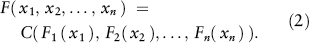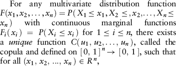 Conversely, if C is a copula and F and G are distribution functions, then the function H defined by Equation 1 is a joint distribution function with margins F and G.