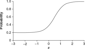 where θ is the value of the trait or ability; P(θ) is the probability of correct response or item endorsement, conditional on θ; ai is the slope or discrimination for item i;bi is the difficulty or threshold for item i; and ci is the lower asymptote or guessing parameter for item i. Sometimes, the symbol g is used instead of c. In Equation 1, as θ decreases relative to b, the second term approaches zero and thus the probability approaches c. If it is reasonable to assume that the proportion of examinees with very low θ who know the correct answer is virtually zero, it is reasonable to assume that those who respond correctly do so by guessing. Hence, the lower asymptote is often labeled the guessing parameter. Figure 1 shows the probabilities from Equation 1 plotted across the range of θ, for a = 1.5, b = 0.5, and c = 0.2. The range of θ is infinite, but the range chosen for the plot was–3 to +3 because most examinees or respondents would fall within this range if the metric were set such that θ had a mean of 0 and standard deviation of 1 (a common, though arbitrary, way of defining the measurement metric in IRT). This function is called an item characteristic curve (ICC) or item response function (IRF). The value of the lower asymptote or guessing parameter in Figure 1 is 0.2, so as θ becomes infinitely low, the probability of a correct response approaches 0.2.