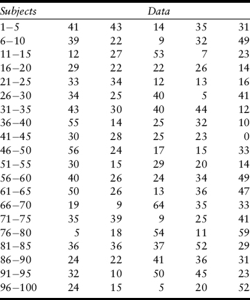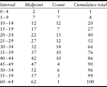 Consider the hypothetical data in Table 1, which tabulates the number of hours of television watched each week by 100 respondents. What is immediately obvious is that it is impossible to comprehend what is going on. The first step in trying to make sense of these data is to put them in rank order, from lowest to highest. This says that the lowest value is 0 and the highest is 64, but it does not yield much more in terms of understanding. Plotting the raw data would result in several problems. First, many of the bars will have heights of zero (e.g., nobody reported watching for one, two, or three hours a week), and most of the other bars will be only one or two units high (i.e., the number of people reporting that specific value). This leads to the second problem, in that it makes it difficult to discern any pattern. Finally, the x-axis will have many values, again interfering with comprehension.