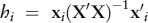 , where xi is the ith row of the n × p design matrix X for p predictors and sample size n. Larger values of hi, where 0 ≤ hi ≤ 1, are indicative of greater leverage. For reasonably large data sets (n–p <50), a value of hi greater than 2p/n is a standard criterion for classification as a leverage point, where