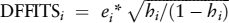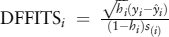 , provides a standardized measure of effect of the ith observation on its fitted (predicted) value. It represents the change, in units of standard errors (SE), in the fitted value brought about by omission of the ith point in fitting the linear model. DFFITS and the Studentized residual are closely related: