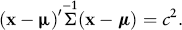 These surfaces are n-dimensional ellipsoids centered at μ, whose axes of symmetry are given by the principal components (the eigenvectors) of σ. Specifically, the length of the ellipsoid along the ith axis is c√λi, where λi is the ith eigenvalue associated with the eigenvector ei (recall that eigenvectors ei and eigenvalues λi are solutions to σei = λiei for i = 1, …, n).