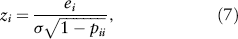 where pii is the ith leverage value, that is, the ith diagonal element in the projection matrix, also known as the hat matrix. This unequal variance property can be coped with by means of standardization of the residuals.