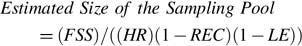 Here FSS stands for the final number of completed interviews the survey must attain; HR stands for the hit rate, or the estimated proportion of the sampling pool that will reach residences; REC stands for respondent exclusion criteria, or the estimated proportion of households that will be deemed ineligible for the particular survey; and LE stands for loss of eligi-bles, or the estimated proportion of eligibles that will end as nonresponders. For example, if in an RDD survey 1,000 completed interviews are desired and the HR is known to be about .65 (65% of the numbers will be households), REC is .05 (5% of households will not have an eligible adult in residence), and LE is .75 (75% of the eligible household will not complete an interview due primarily either to refusals or non-contacts), the estimated size of the sampling pool needed to complete this survey would be (1000)/((.65)(1 − .05)(1 − .75)) or 6,478 RDD numbers. Thus to be on the safe side, the researchers might decide to start with a sampling pool of 8,000 numbers.